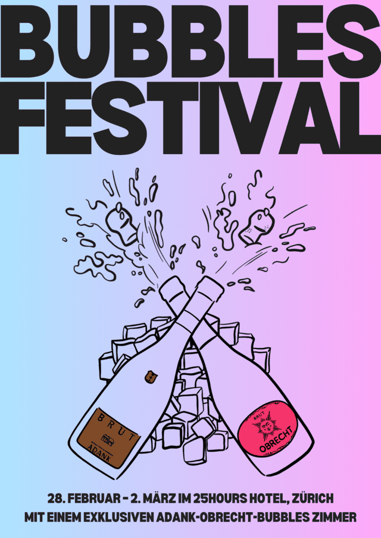 28.2. – 2.3.25 findet das Bubbles Festival im 25 Hours Hotel in Zürich statt. 22 Aussteller und Masterclasses erwarten euch. Inklusive einem Adank-Obrecht-Bubble Zimmer.