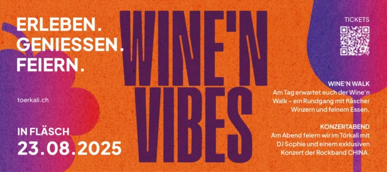 Am Samstag, 23.08.2025 wird Fläsch zum Treffpunkt für Genussmenschen und Musikliebhaber. Wine’n Vibes im Törkali – ein Event, das Wein, Kulinarik und Live-Musik auf einzigartige Weise vereint.